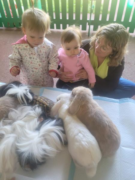 Les toutes petites sections de l’école maternelle Gare sont venues passer un moment auprès de nos pitchous et là, surprise !!! sous le préau : petits lapins, cochons d’inde et tortue étaient présents ce jour-là; carottes, salade, branches de céleris ont pu être coupées et préparées par nos petits, pour permettre à nos résidents du jour de se régaler, le tout orchestré par Delphine de Bulle de calins, petits comme grands, tout le monde semblait ravis !!!